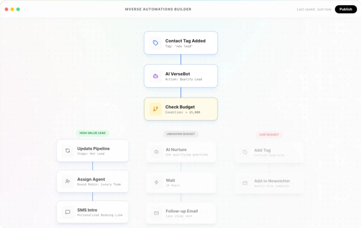 We automate the repetitive tasks like initial lead follow-ups, long-term nurturing, and social scheduling so you have more time for the human tasks like showings, listings, and closings. Your brand voice stays consistent, but your manual workload disappears.